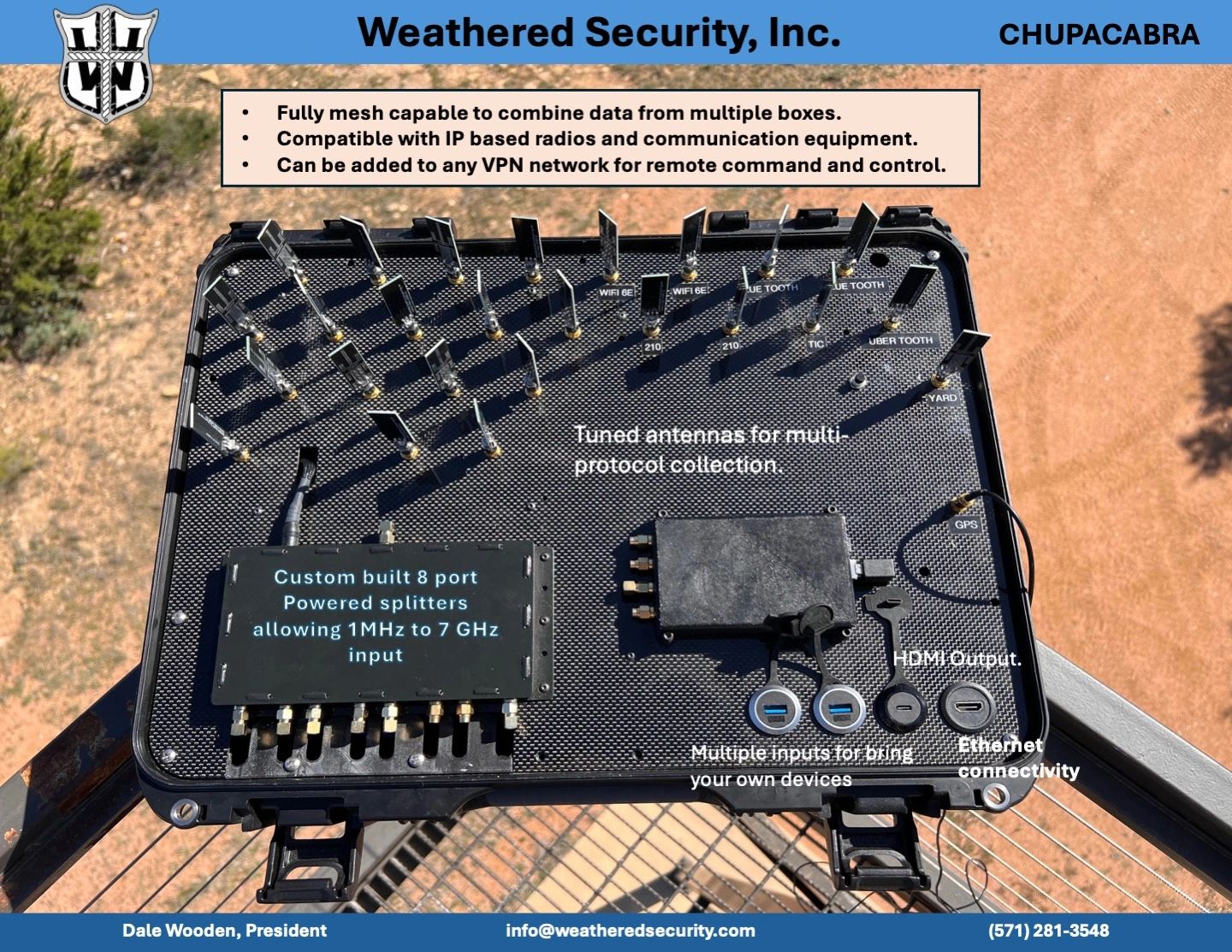 Weathered Security provides a modular and open architecture family of systems that support surveillance/counter-surveillance, spectrum analysis, target engagement, data link analysis, personnel recovery, and other mission requirements. The Vampire, Chupacabra, and Ghost are customizable, vary in size from a backpack to an airline carry-on, and extremely intuitive to operate.